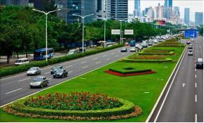 (三)用艺术的视角构造城市道路绿化景观。上海花木路和深南大道绿化风格各具特色。花木路道路宽度小于深南大道,道路外侧绿地以高大乔木支撑绿化空间,形成外侧绿色长廊;中部分车带内以低矮植物为主,营造低层空间;整体街路空间外高内低,既能有效减少街路环境对外侧环境的影响,又避免了分车带对街路空间的分割,使得街路景观完整、统一。深南大道是深圳的一张城市名片,绿化风格特点鲜明,无论是园林植物种类还是植物量都比较丰富,并且养护水平较高。其中,中央分车带采用规则式设计,利用黄金榕、假连翘、美人蕉、红桑、红草等开花及色叶植物,组合成规则混栽花坛或单种类花坛,以长方形、圆形或菱形相间重复出现,配合灌木花坛的整形修剪,形成一道规则的彩带,镶在草坪之上,与整齐划一的道路、路灯相对应,充满韵律节奏之美。街路园林植物景观设计应注重空间尺度的把握,营造外高内低的空间关系,保证街路景观的完整性。