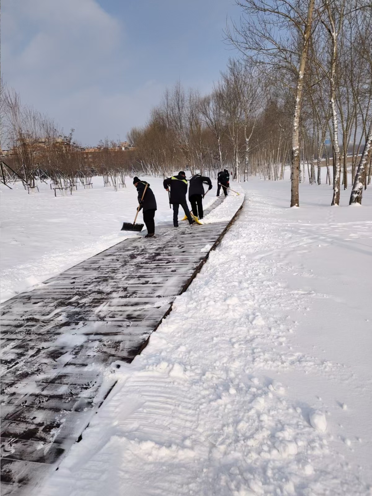 本次扫雪除冰行动累计投入人员六十余人次,清理园路广场面积约4.7万平方米,处理乔木灌木积雪千余株,及时清除安全隐患,有效防止树木冻害和损伤,切实保障了市民游园安全和苗木景观完好。