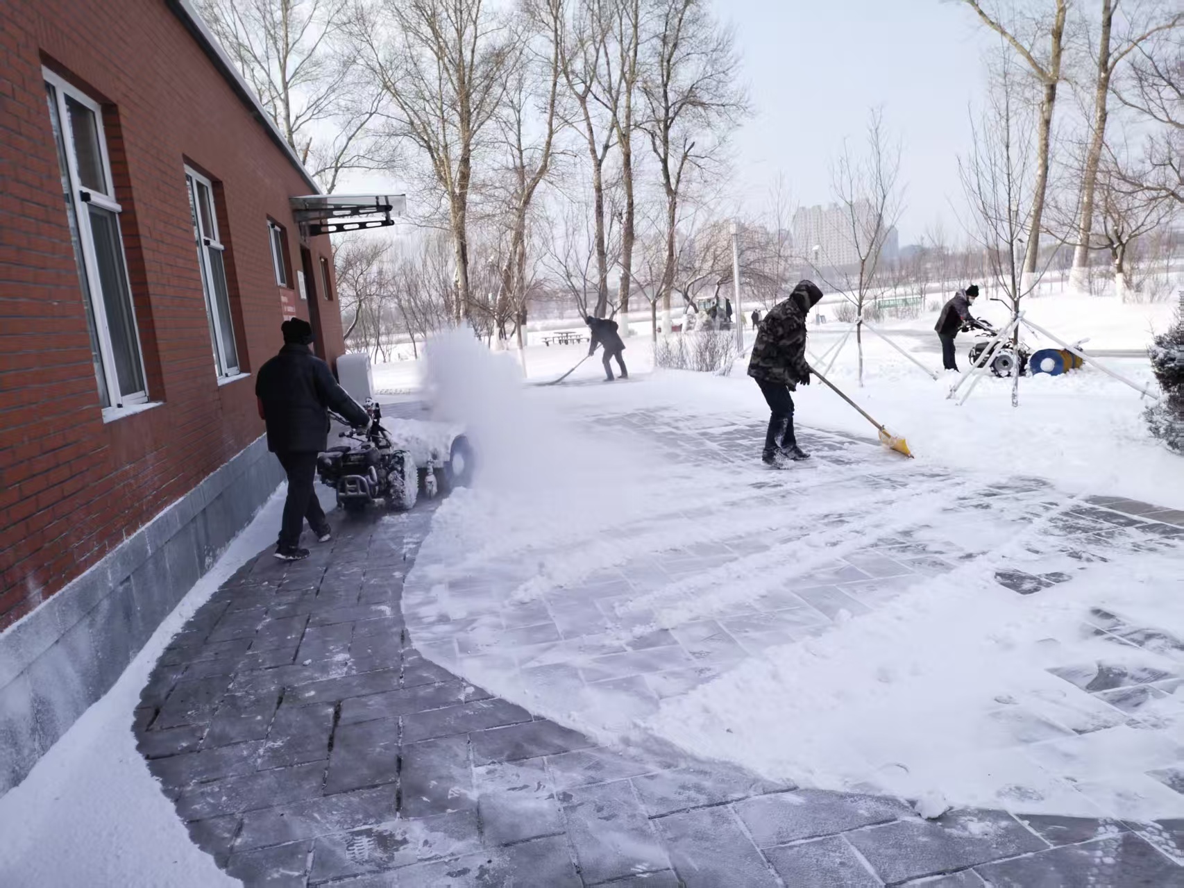协同作业,高效清障。各园区采用人工与机械相结合的方式,运用扫雪机、大型扫雪车等设备,及时清除主干道、广场积雪,同时在易滑区域设置警示标识,加强保安巡逻力度,安排绿化管理人员逐个排查并清理树枝与绿篱积雪情况,及时处理突发情况,保障游客游园安全。