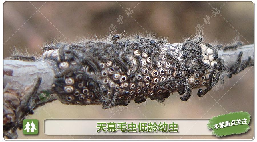 天幕毛虫:幼虫危害期,目前为低龄幼虫。我市寄主为京桃、榆叶梅、山杏、柳、杨等多种植物。
