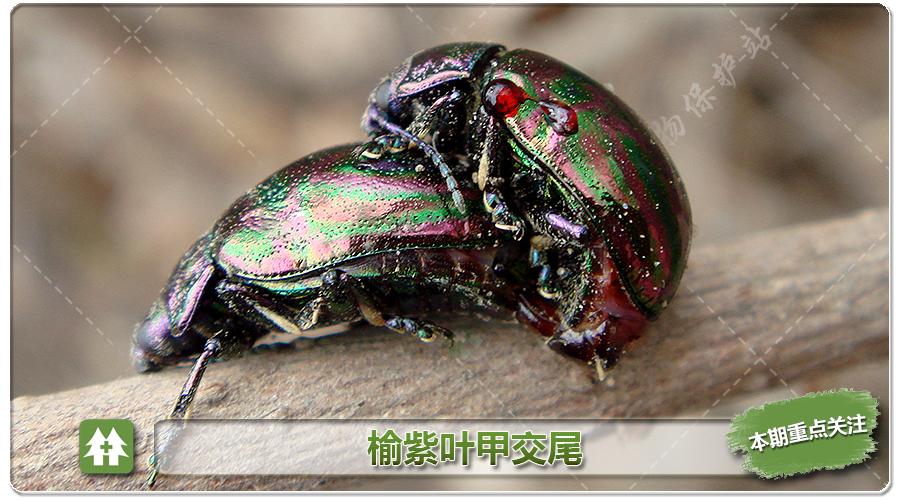 榆紫叶甲:成虫上树取食并交尾。我市寄主为榆,个别地点虫口密度较大。
