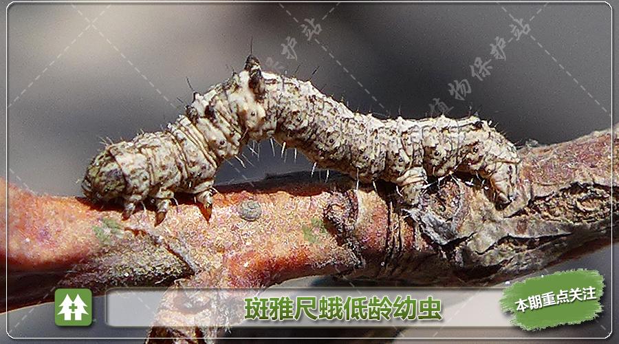 斑雅尺蛾:幼虫已分散取食,幼虫具有很强隐蔽性,分散后不容易被发现。个别路段虫口密度大。我市寄主为女贞、绣线菊、小叶丁香、紫叶李、李子、杨、红瑞木、锦鸡儿等植物。