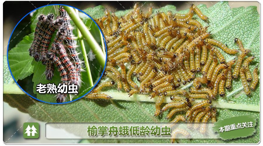 榆掌舟蛾:低龄幼虫群集于叶片上,把叶片吃成白色透明网状,3龄后分散取食,严重时可将整叶吃光,仅留叶柄。我市寄主为榆。