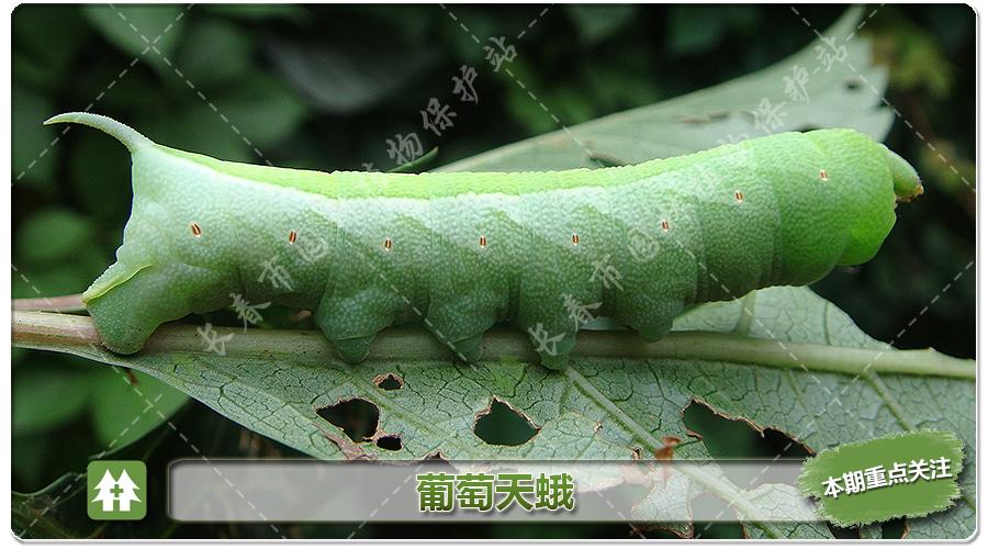 葡萄天蛾:幼虫危害期,幼虫老熟时食量大,可将叶片吃光只余叶柄。我市寄主为葡萄、五叶地锦。