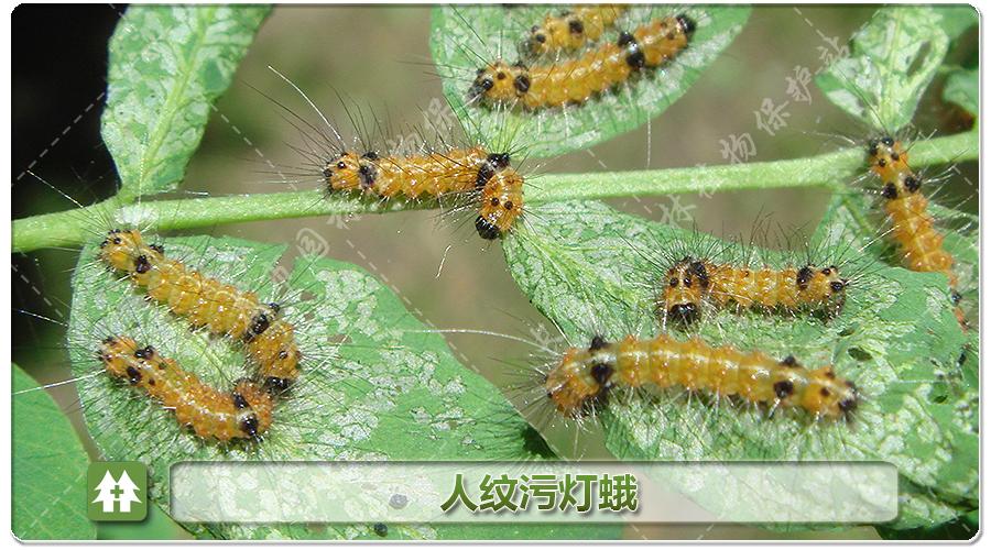 人纹污灯蛾:低龄幼虫危害期,群集在叶片上啃食叶肉。我市寄主为杨、槐、榆等多种植物。