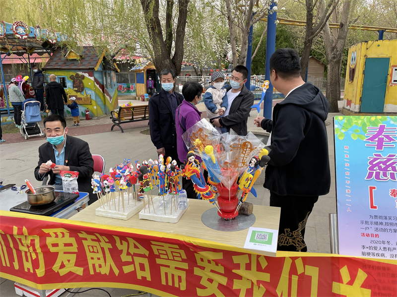 活动前,二支部党员制作了介绍“一个支部帮一户”帮扶困难群众情况展板,方便游人了解包保户家庭情况。活动中,公园技术科绿化班党员范振兴同志负责“面人”、“糖人”手工创作,其余党员同志协助,并向园区内游客介绍此次义卖的目的,号召游客献出一份爱心,引导大家将善款放入指定的募捐箱中,安排专门同志负责统计记账所得善款。游客们对精巧的“面人”、“糖人”手工制品爱不释手,纷纷参与到此次义卖活动当中。活动后,义卖所得善款将全部用于对包保户扶贫济困,由专人监督、审计,确保专款专用。