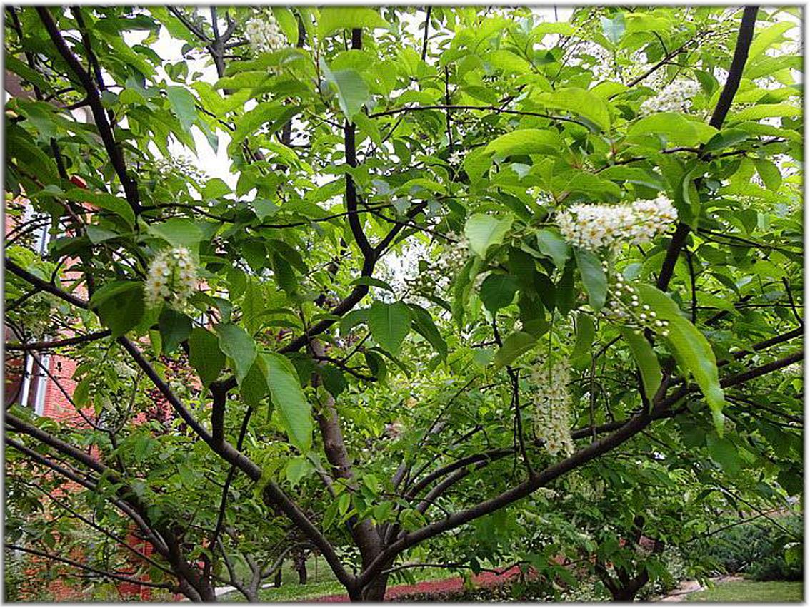 落叶乔木,高达15米。树皮黑褐色,有明显皮孔,老树皮纵裂。小枝光滑,紫褐色,树基部常有大量萌生条。单叶互生,椭圆形或倒卵形,基部圆形或近楔形,先端渐尖,边缘有细尖锯齿。叶表深绿色,叶背灰绿色,叶基处常有2腺体。多花构成总状花序下垂,花白色,花期4-5月。核果近球形,黑色,果期8-9月。