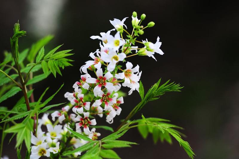 落叶灌木或小乔木,高达8米;常见多为3-5米,并丛生状。树皮灰褐色,粗糙纵条裂。小枝幼时紫褐色,有毛,后脱落。奇数羽状复叶互生,小叶片9-19枚,长椭圆形至披针形,先端尖,基部楔形,缘有锯齿,表面光滑,背面疏生星状柔毛。花杂性,整齐,顶生总状或圆锥花序,花瓣白色,基部有由黄变红之斑晕,4、5月间与叶同放。蒴果椭球形,室背3瓣裂。