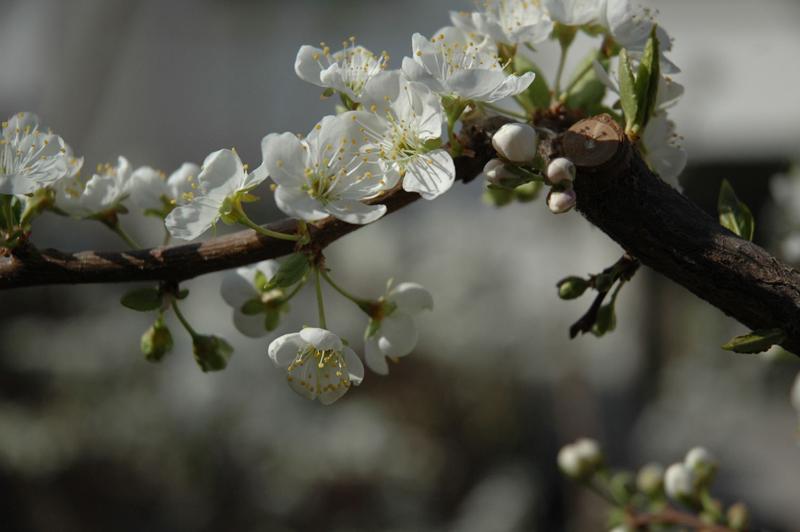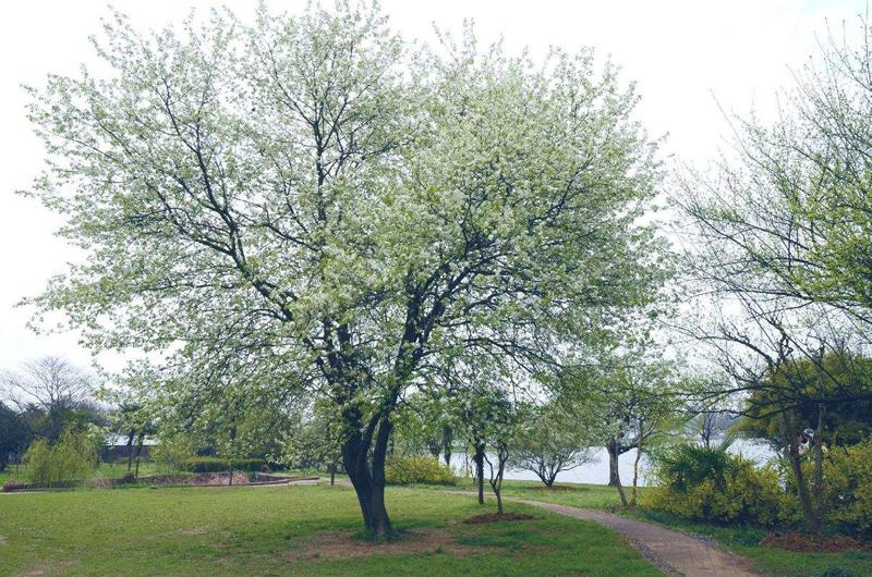 落叶乔木,高达12米。树皮粗糙,灰褐色。小枝紫褐色,平滑无毛,有光泽。单叶互生,多呈倒卵状椭圆形,先端突尖或渐尖,基部楔形,边缘有不规则细钝齿,叶背脉腋有簇毛。花白色,具长柄,2-4朵(通常3朵)簇生,花期4月,叶前开花。核果近球形,黄绿色至紫色,果皮无毛,具1纵沟,外被蜡粉,果期7月。