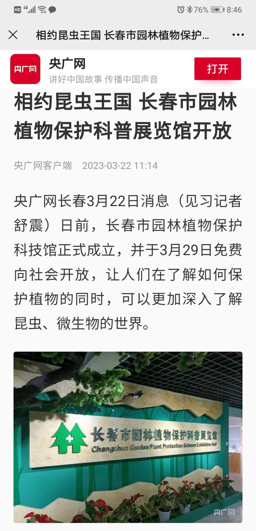 开馆前,央广网、吉林守望都市、城市晚报等20余家媒体对此进行宣传报道。开馆当日,长春市园林植物保护站利用抖音账号在馆内进行现场直播,带网友“云游”展览馆。馆内包括活体昆虫展示、显微镜观察等互动环节。入馆参观的群众都纷纷表示,展览内容丰富多样,昆虫标本奇特美丽,不虚此行。