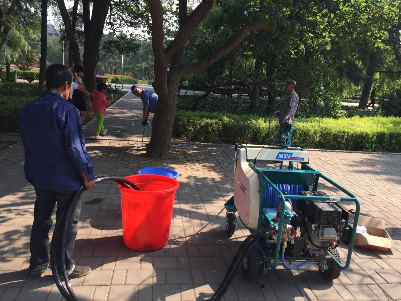 由于公园常年游客量大,使得树体周边硬质铺装处过度踩踏,导致土壤板结,通透性和排水性较差,复壮工作难度较大。为了对园区内古树名木进行科学、高效的复壮,加快复壮效率,公园采购了一台深根施肥机,对古树名木的地下部分复壮起到了重要作用。在古树树冠投影范围内,通过机器的压强,在地下土壤里准确地将有机肥和生根剂均匀的喷洒到须根上,补充N、P、K等所需微量元素。并且根据目前土壤状况,有效地调节适宜阔叶树木生长的最佳酸碱度。