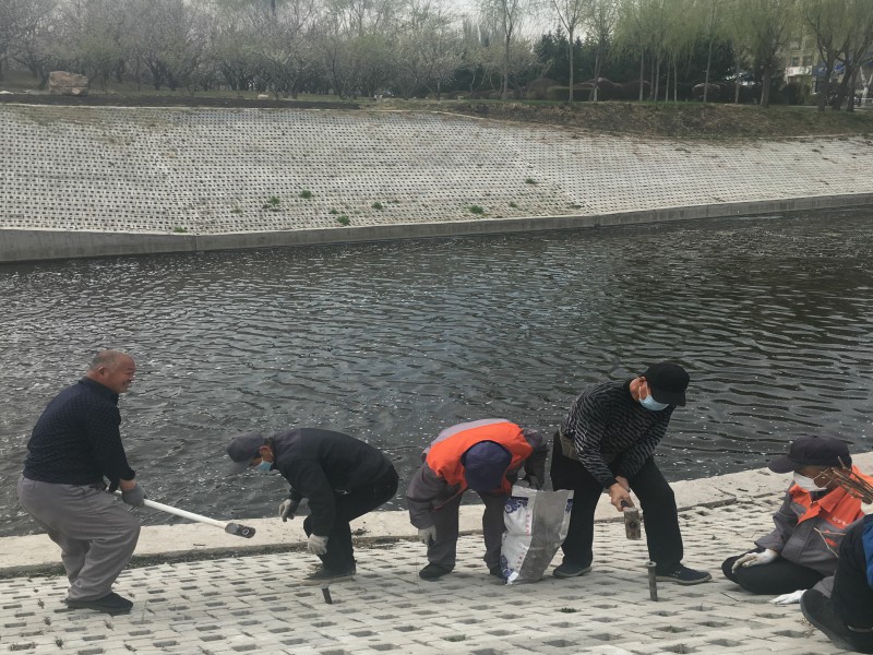 夏季来临,护坡连锁砖方孔内自然长出各种野草,杂乱无章,影响湖岸两侧美观。护坡立体面约呈50度角,非常倾斜,在护坡上人工拔草非常危险,操作难度很大。但为提高护坡两岸的绿化景观,今年天嘉公园技术人员集思广益,克服困难,在陡峭的护坡连锁砖方孔内栽植耐贫瘠土壤适应性强的五叶地锦,让其由下向上自然攀爬,形成绿色护坡景观。由于护坡下的土壤内含有很多砖头瓦块,为提高成活率,栽植时先用铁锤打30㎝深孔穴,外运新土覆盖。