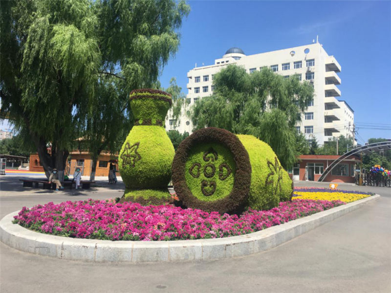正对北门的是一个长椭圆形花坛,花坛中是以一对花瓶为主题的立体花坛。我国古代将花瓶视为平安的象征,古人也会在家中堂屋摆放四个花瓶,寓意“四平八稳”;同时,花瓶是用来盛放美丽的鲜花的,因此,人们也将花瓶寓意成美丽,漂亮。花坛之中,两个花瓶,一躺一立,搭配栽植四种颜色的草花,营造出花海从瓶中倾泻而出的美景。
