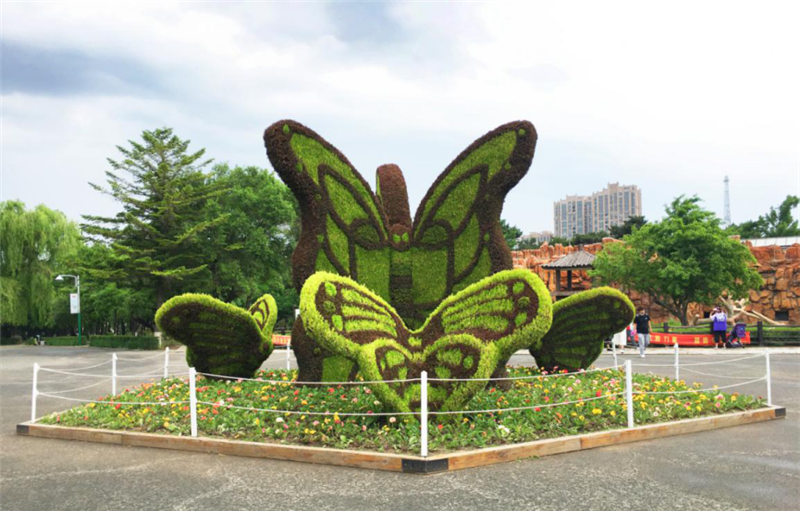 公园五通广场的中心,是一组翩翩起舞的蝴蝶主题立体花坛,下面是多种颜色混栽的非洲菊,营造出多姿多彩、蝶舞花丛的美景。中间的主景蝴蝶有三个观赏面,对应三只小型蝴蝶,使游客无论从哪一个方向走来,都能看到花坛最美的一面。蝴蝶身上的花纹和下面栽植的草花,每年各有不同,富有新意。