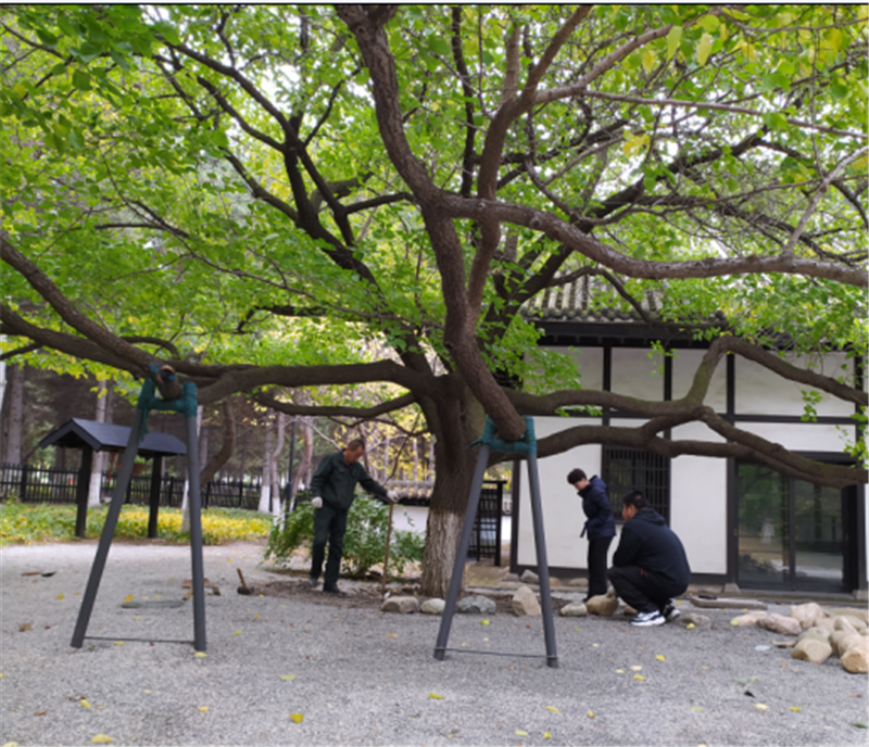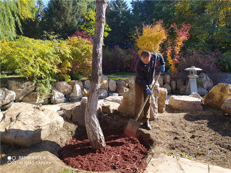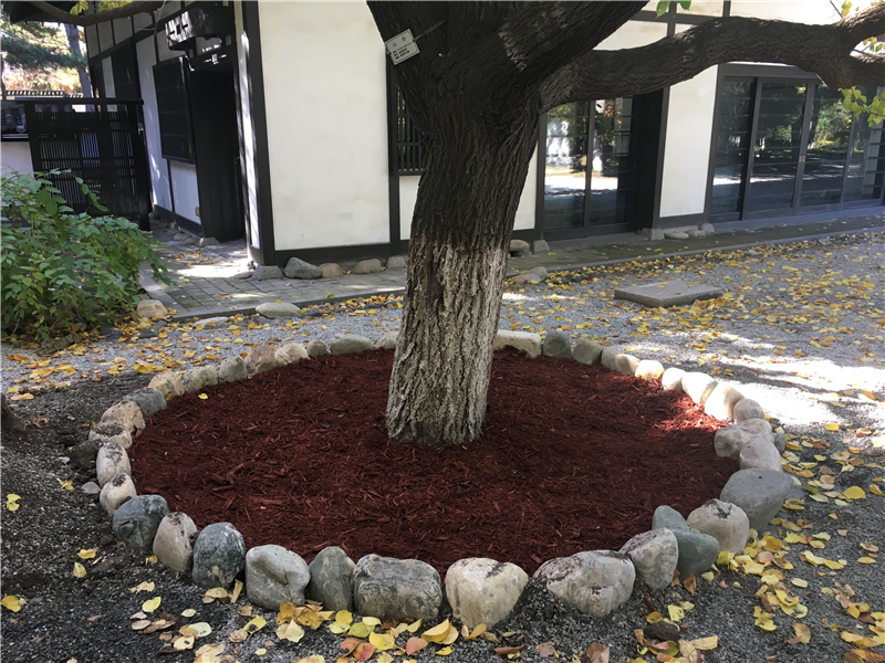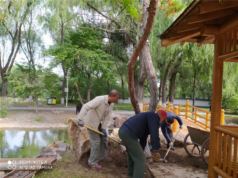 一是为“友谊园”内一株珍贵的大山杏制作景观石树圈。此举起到了点缀、美化景观的作用。精心打造了地形,围好边界,选用直径30-40cm的景观石均匀摆放,再使用水泥混合材料填缝进行加固。为进一步增强透气性,还在树圈内铺设了彩色木屑,整体效果美观大方,成为一道亮丽的风景。