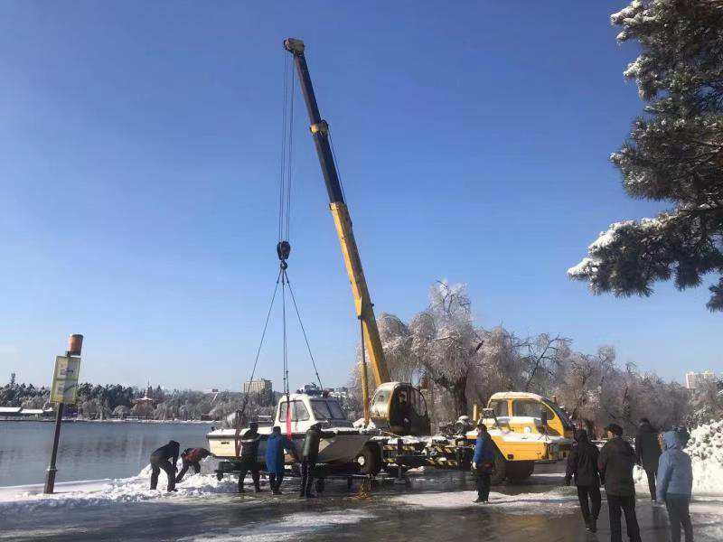 11月20日,在完成本年度最后一项任务后,我园暂在湖面留存一条救助船,将其余救助艇、船托运全部上岸。今年,我园救助艇在水面救援工作中起到了举足轻重的作用。2020年,我园累计应急救援20余次,共制止下湖野浴56起,避免了游客溺水事件的发生,保障了游客的人身安全;同时,在清理偷捕偷钓方面更是离不开救助艇的协助,全年共累计清理偷捕偷钓工具330余件,劝离偷钓者1330余人次。