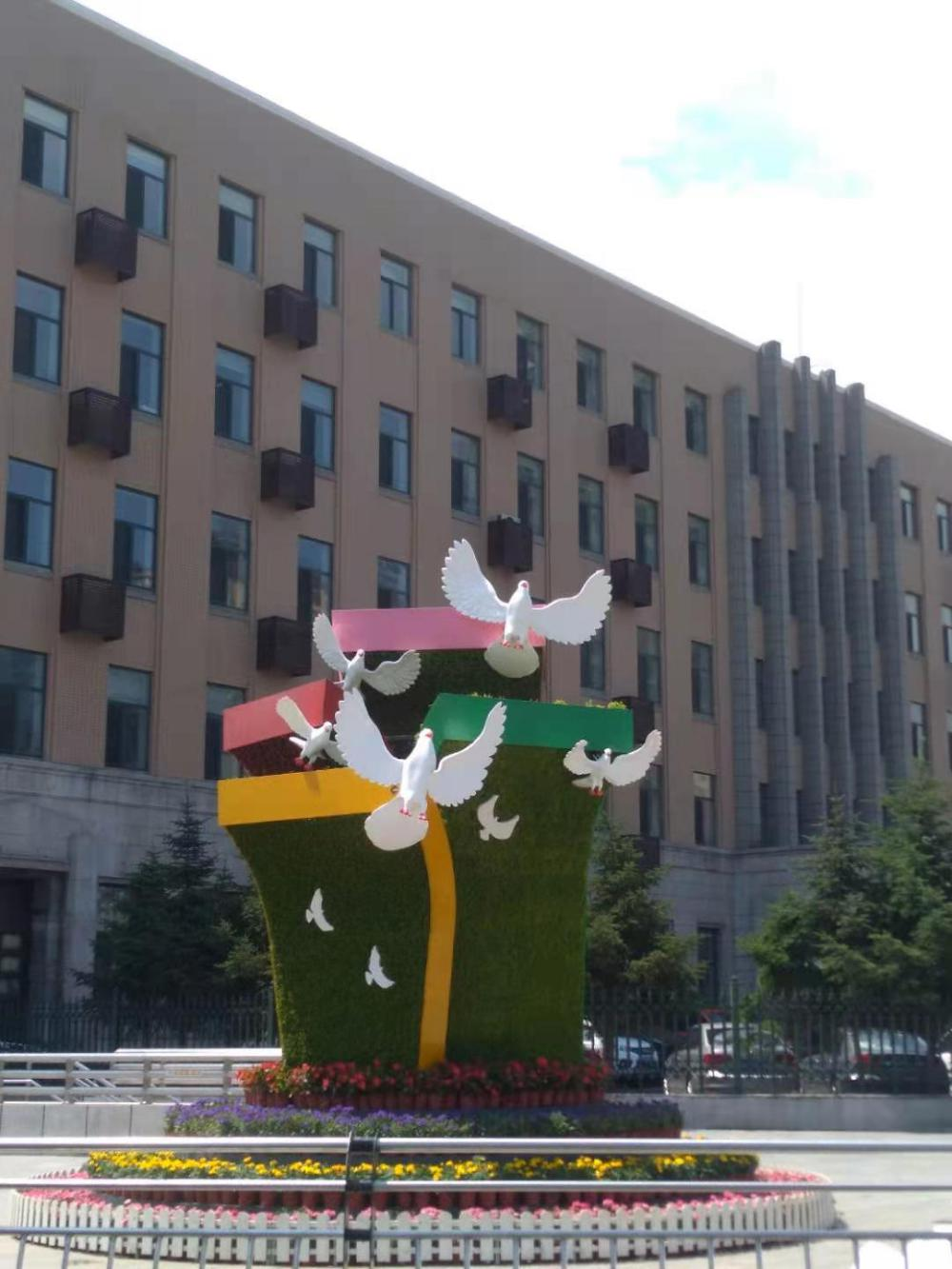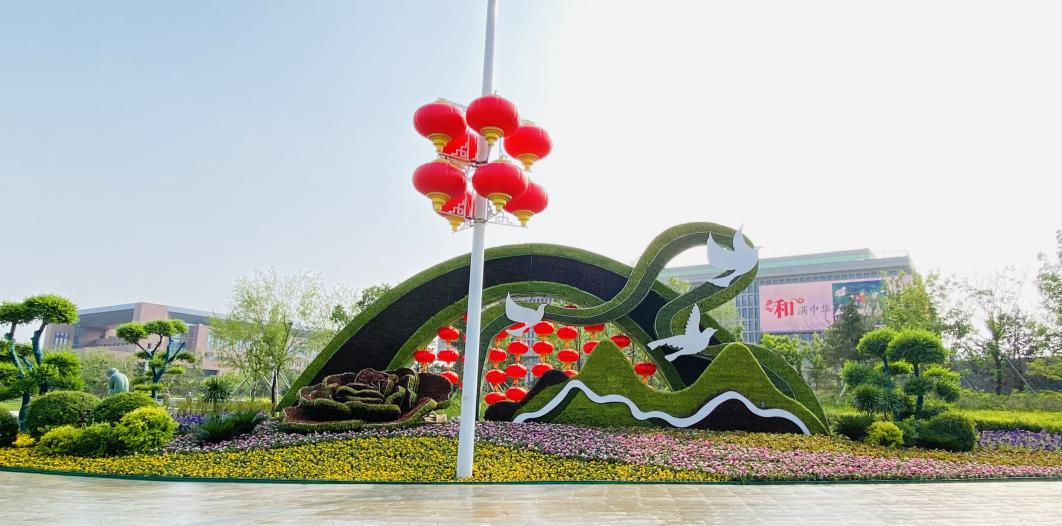 南三环与人民大街交汇西南角,设置“永远跟党走”主题立体花坛,以“飞鸟、飘带、山峦、鲜花”为要素,配以色彩艳丽的植物材料,用简洁大气的形式,表达了在中国共产党的领导下,我们正在全面实现民族伟大复兴的大路上。该组花坛6月1日至6月5日造型构件安装完成,6月8日至13日植物栽植完成,占地1200㎡左右,其中主体为钢筋结构造型,覆盖四季海棠穴盘苗及五色草,地被花卉使用大花海棠、孔雀草、风铃草、小丽花。