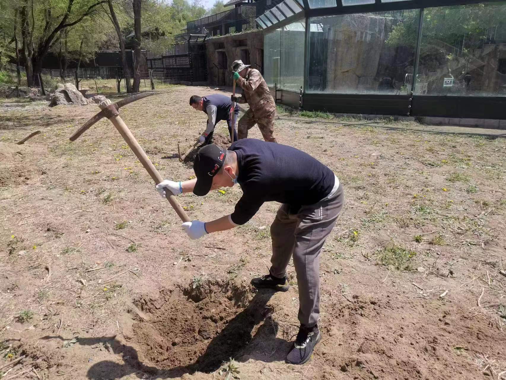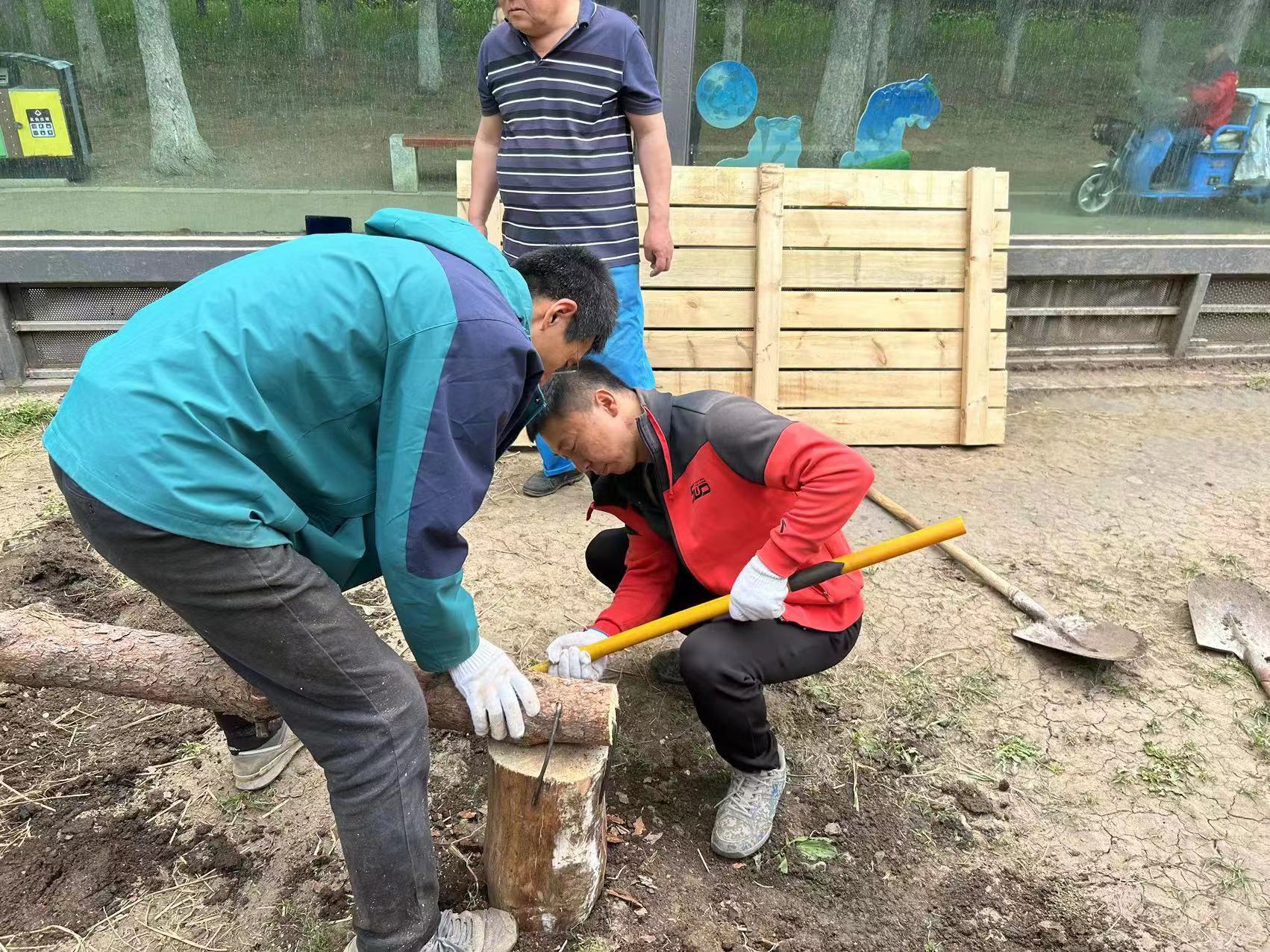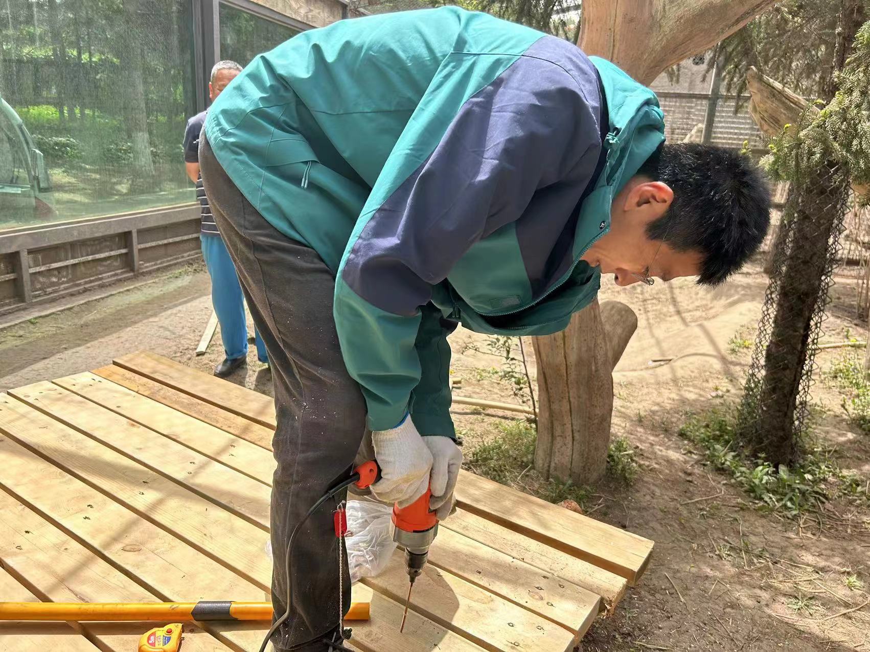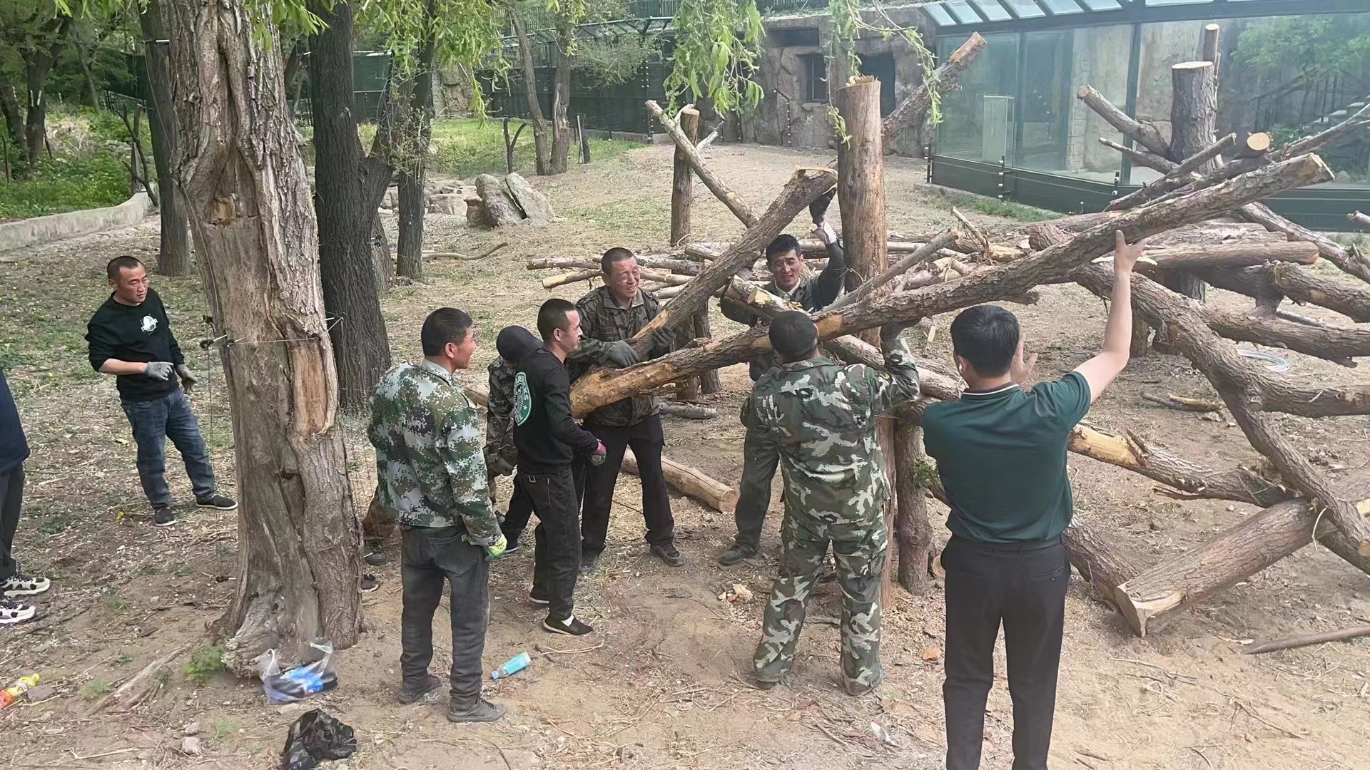 丰容改造的重要一项就是为动物搭建高矮不一的木质栖架,公园动物饲养科科长王俊峰带领20余名业务骨干,从木材装车、运输,到清理场地、挖坑,再到埋树桩、搭栖架,每一步大家都克服困难亲力亲为,木头太重就多人抬,人员紧张就轮流干,看着毛孩子们玩儿的不亦乐乎,饲养员的一切辛苦付出都觉得格外值得。