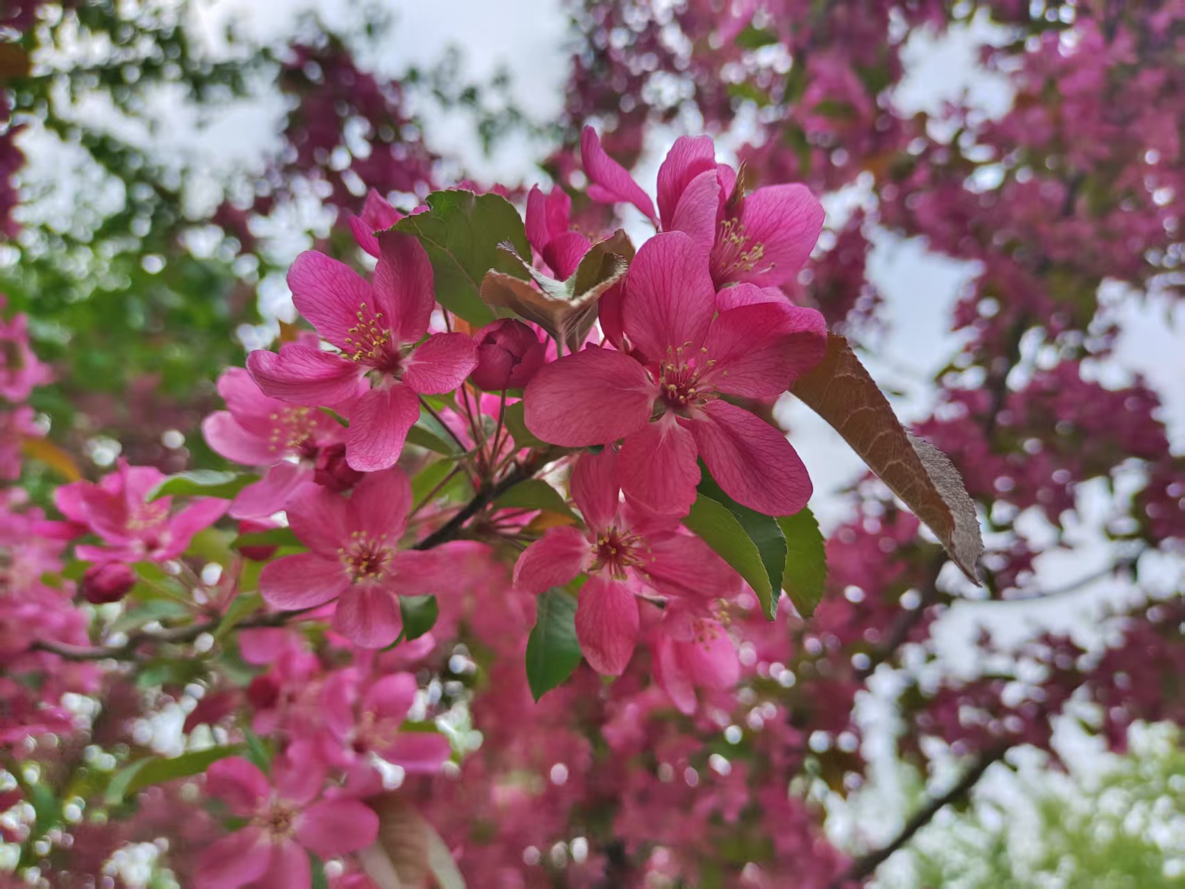 王族海棠是一个集红叶、红花、红果为一体的优秀品种,花、叶、果甚至枝干均为紫红色,是少有的色叶海棠品种。“忠贤亭”旁,王族海棠林春意正浓。春风轻拂,花瓣如粉色蝶影翩跹,飘落于地,铺就一片浪漫花毯,引得市民与摄影爱好者纷纷驻足,赏景留影。