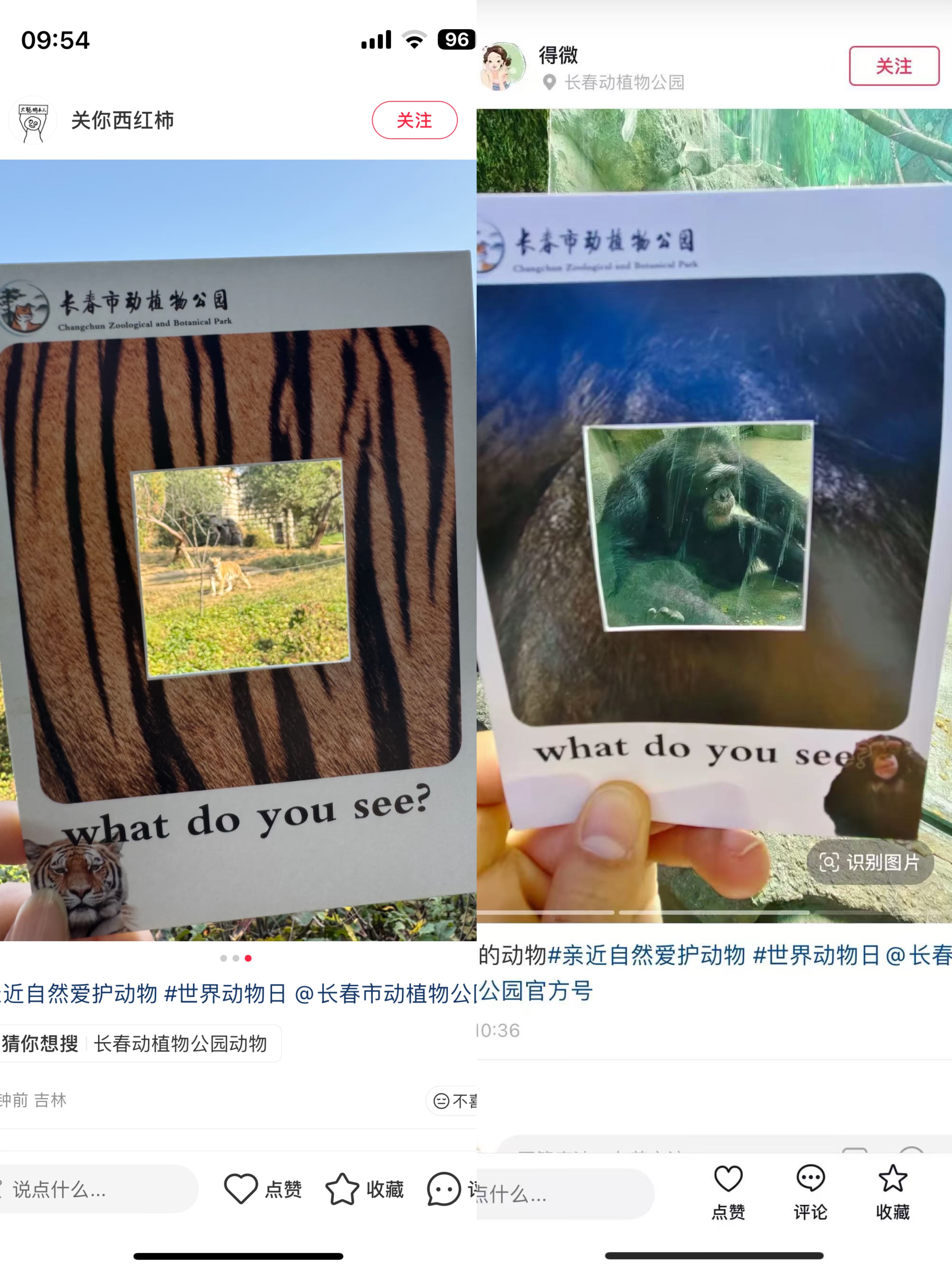 “做客动物家”互动打卡活动同样反响热烈。据统计,近千名游客领取任务卡,走进指定动物场馆与动物“合影互动”,并通过小红书、抖音等平台分享游园体验。话题#亲近自然,爱护动物世界动物日#累计浏览量突破万次,在线上延续了活动的温度与影响力。
