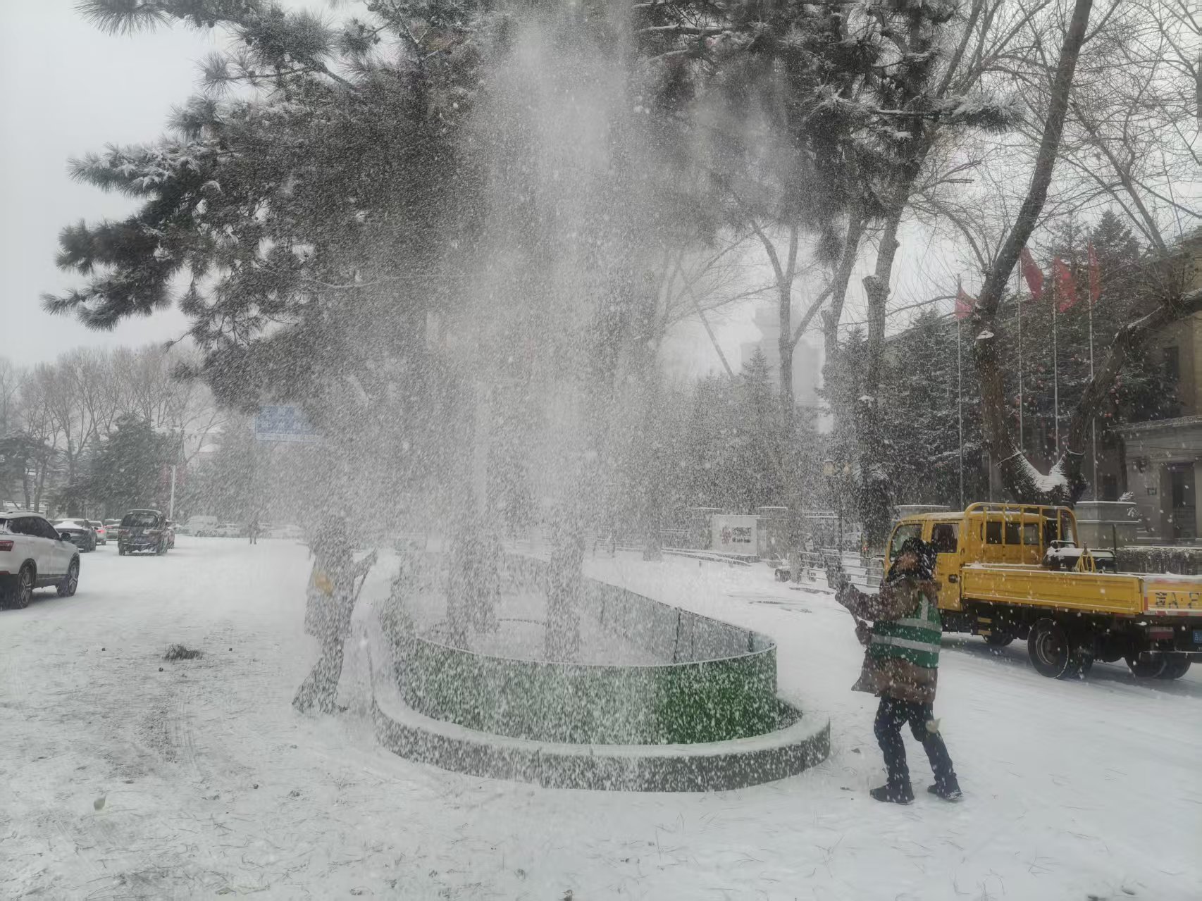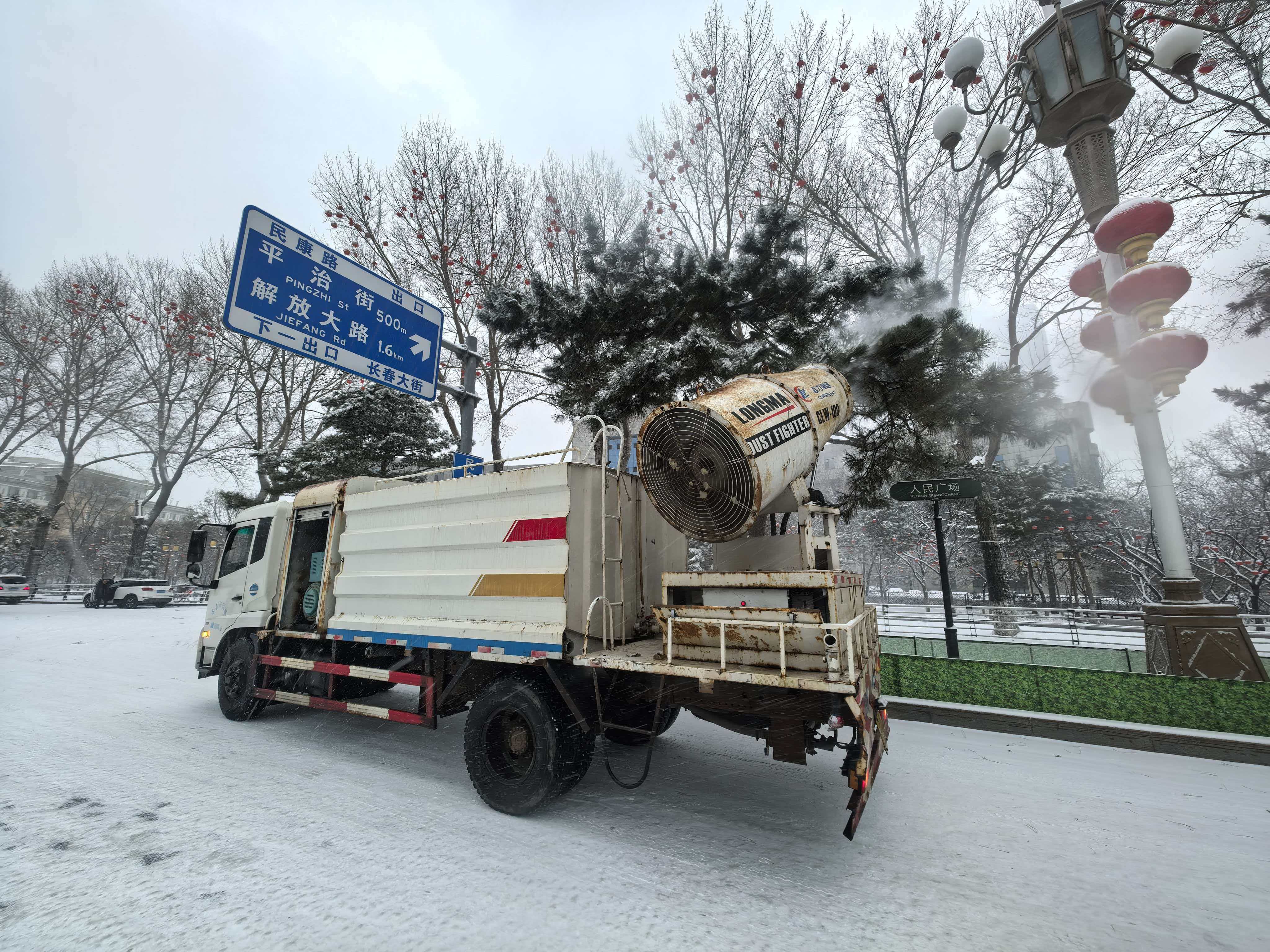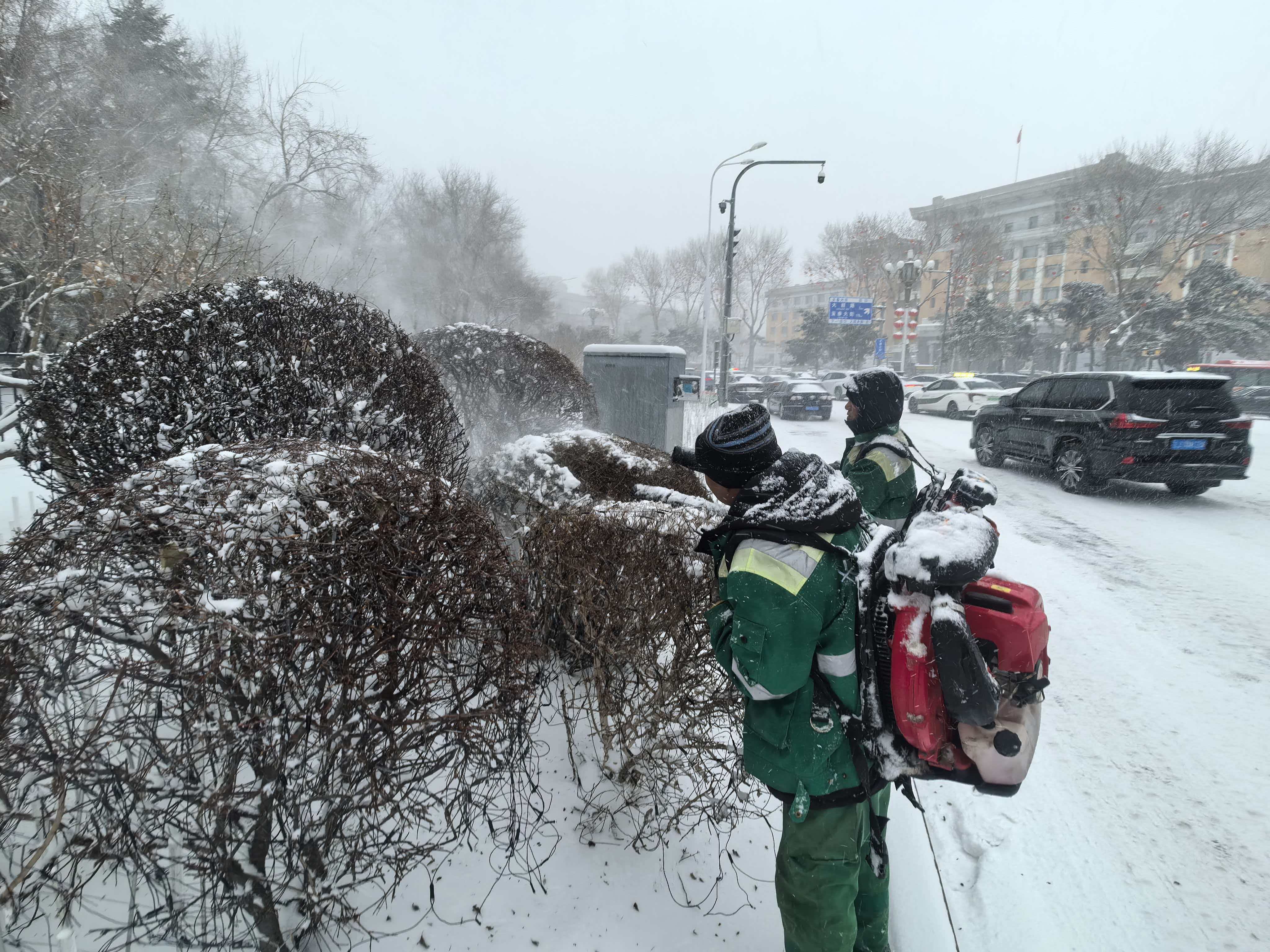 精准施策,养护人员精准实施“人工+机械”除雪组合作业。作业人员携便携式吹雪机,对街路两侧绿化带、广场绿地内的造型树、造型球等疏松积雪进行快速吹扫,避免积雪堆积压实损伤植物枝干;对黑皮油松等高大乔木,出动雾炮车清除树冠积雪,同步采用人工打雪的方式,按照“由上至下、轻敲慢抖” 的原则,小心清除层层积雪,防止因积雪叠加导致枝干断裂,确保城市绿化景观安全越冬。共调动雾炮车、高空作业车等工程车辆22台次,携带打雪竹竿、树木支架、吹雪机等5种工具,出动应急作业人员150人次投入清雪工作。