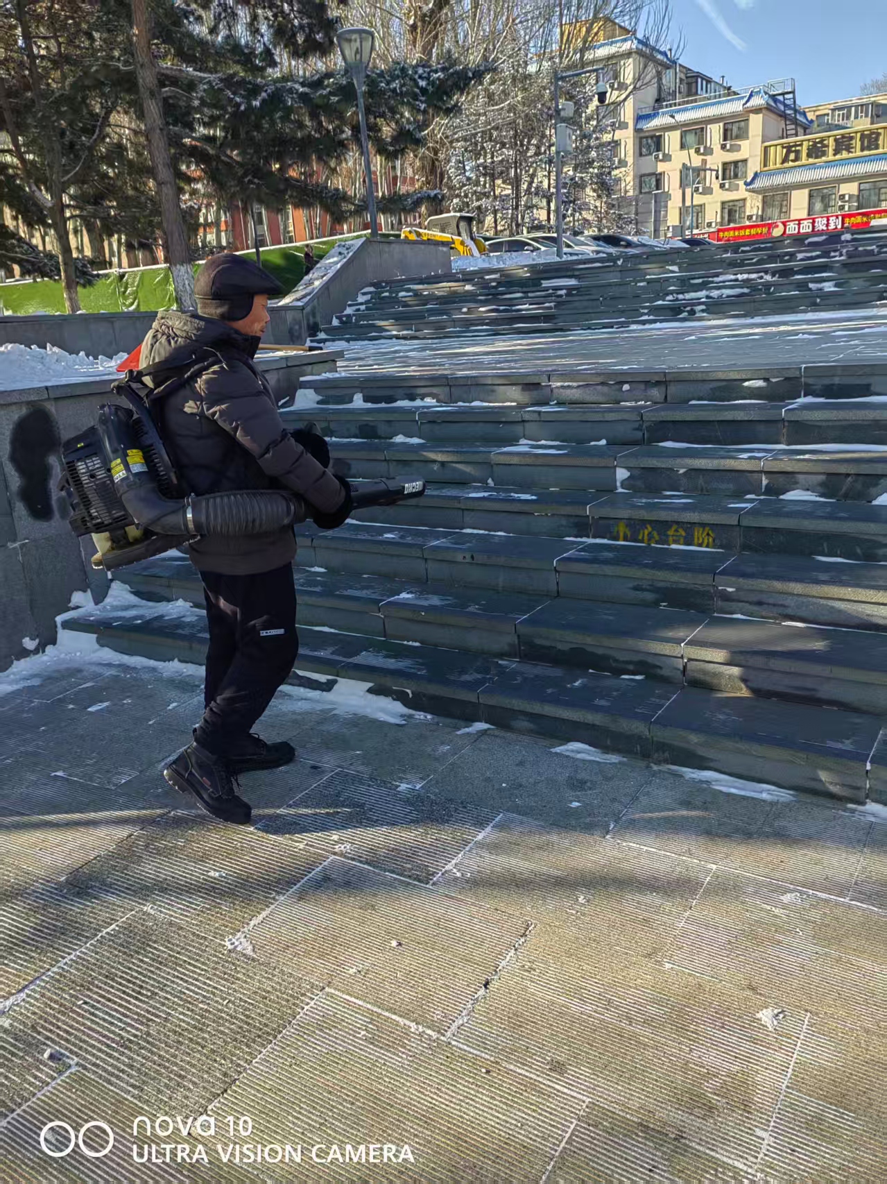 作业现场,寒气逼人,但清雪人员的工作热情丝毫不减。中心采取“机械为主、人工为辅、协同高效”的作业模式,结合园区地形和积雪情况科学调配力量,高效推进清雪工作。大型扫雪车率先开道,主要对广场及园区主环路、小广场等开阔区域进行快速清扫,打通核心通道;清雪设备紧随其后,清理积雪死角,跟进大型机械难以覆盖的积雪盲区;工作人员手持雪板等工具,对台阶、出入口、健身场等游客通行高频区域进行精细化清理,并做好防滑处理。