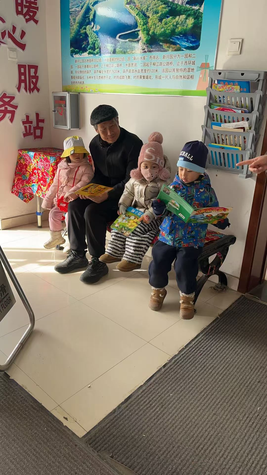 在儿童图书阅览区,几位老人和小朋友围坐在一起,沉浸在温馨的阅读氛围中。色彩鲜艳的儿童读物、柔软的座椅,让这里成为孩子们的“小乐园”,也让陪同的家长们能安心歇脚。