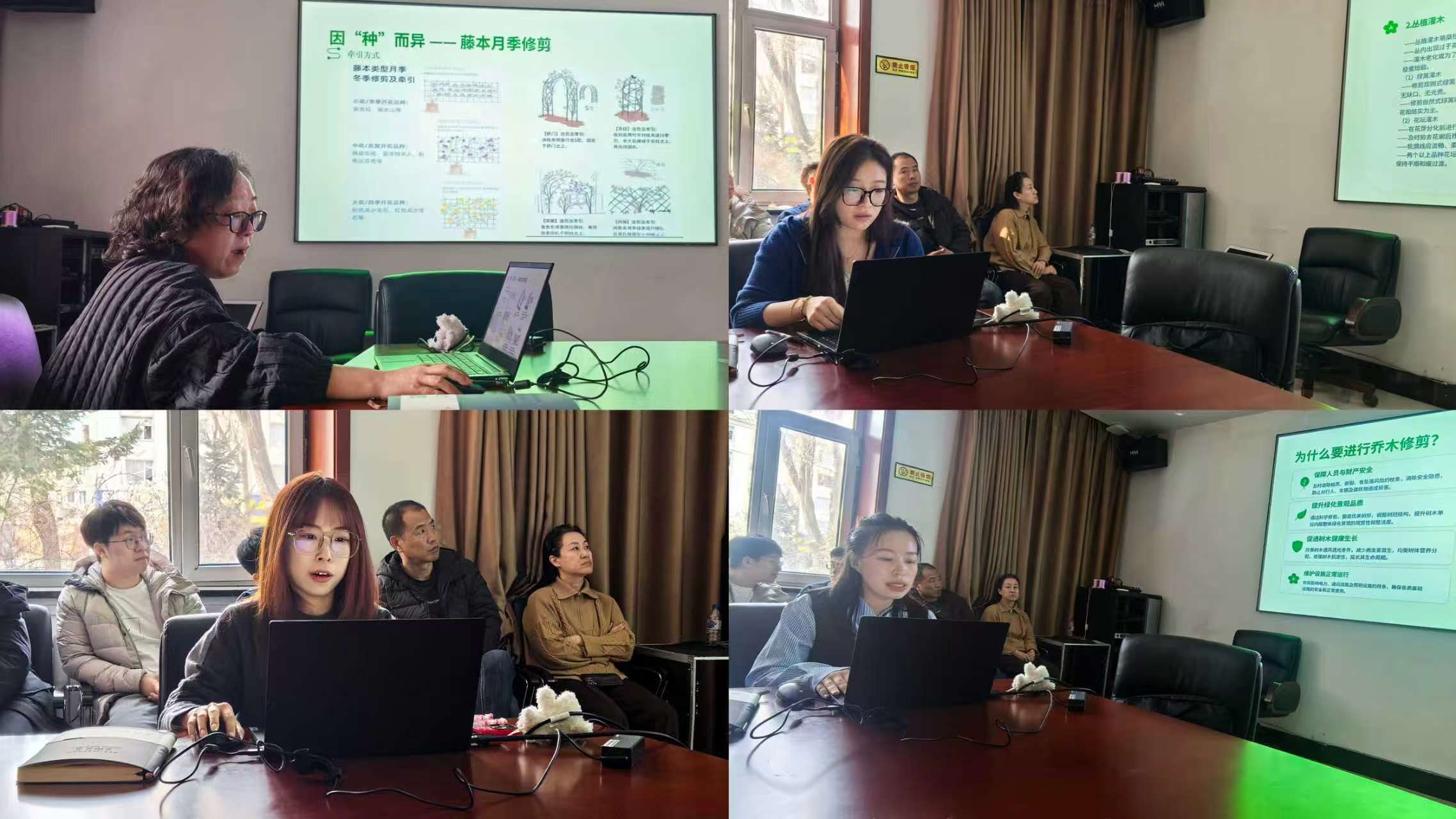 在为期三天的自学准备基础上,全体成员集中观看园林植物科学修剪教学视频。视频内容涵盖常见乔灌木修剪时机、基本技法及典型树形调控要点,通过可视化演示,建立了对科学修剪的直观认识,为后续分类研讨打下基础。视频结束后,各科室立足专业领域,针对不同植物类别依次讲解修剪技术要求。质量控制和安全科结合针叶树生长特性,讲解实操要点与安全规范;总工办聚焦灌木,分享整形修剪手法;科研室围绕月季、绣球等花灌木,解析花期调控与修剪时机;规划和维护指导科系统梳理乔木修剪技术,涵盖枝干取舍及分类要点;办公室针对模纹植物,重点讲解造型修剪与整齐度把控;园林信息中心则结合草坪生长规律,分享修剪高度、频次及养护要点。各科室准备充分、讲解透彻,现场形成了“专业协同、分类施策”的技术共享氛围。