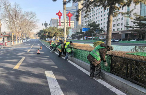街路方面:一是浇灌封冻水。根据天气情况和土壤墒情,对所辖街路绿地内植物浇灌封冻水,避免植物在冬季因生理失水而引发干冻。二是喷施防冻液、缠绕保温带。对人民大街、同志街、南湖大路等重要街路的造型树、红枫、白榆等耐寒性较弱的落叶乔木采用喷施防冻液、树木主干部位缠绕保温保湿带、安装波纹管等措施进行防寒养护处理。三是安装挡雪板。在人民大街、西安大路等绿化带安装挡雪板,避免积雪对植物造成伤害。在安装中做到上线平齐、竖面一致,确保坚固结实、整齐美观。目前安装工作正在加速推进。