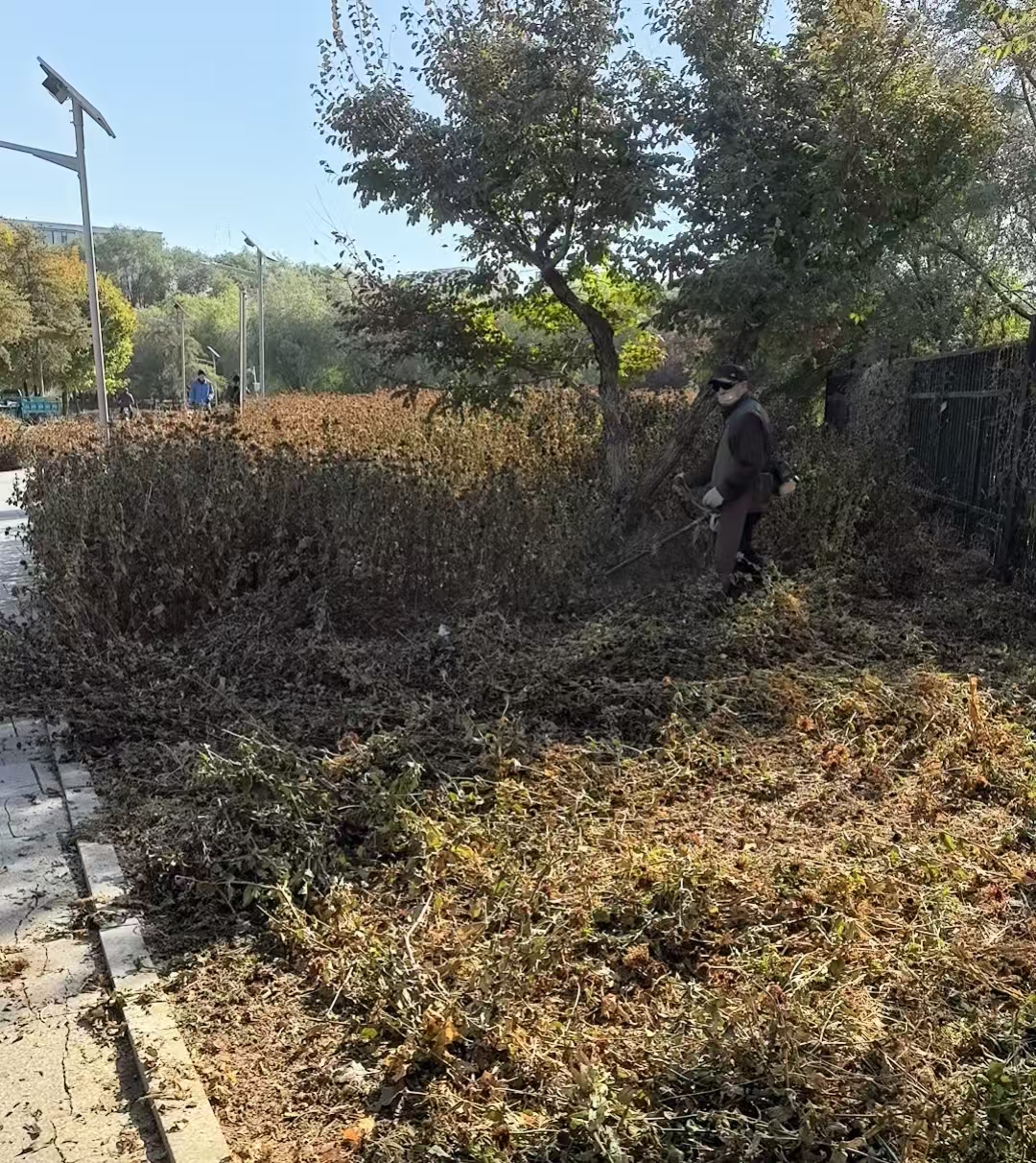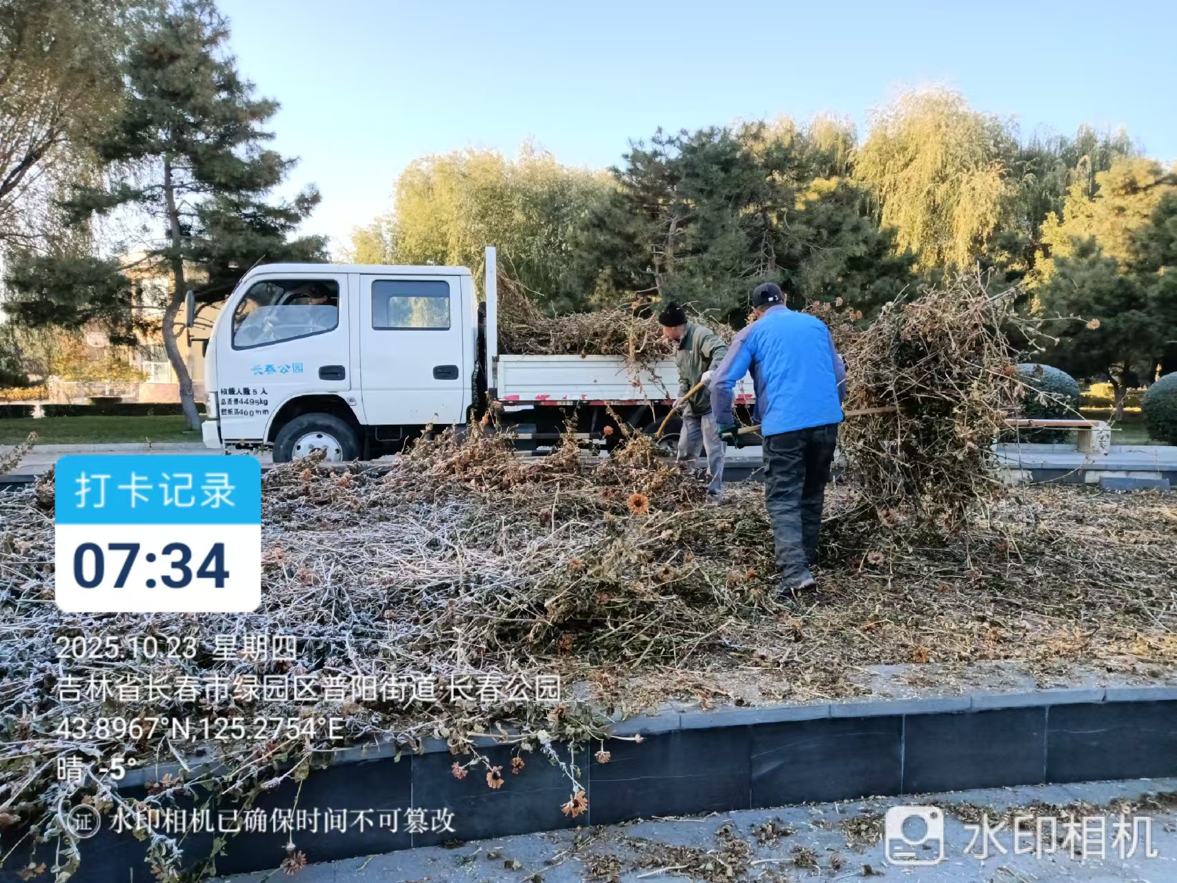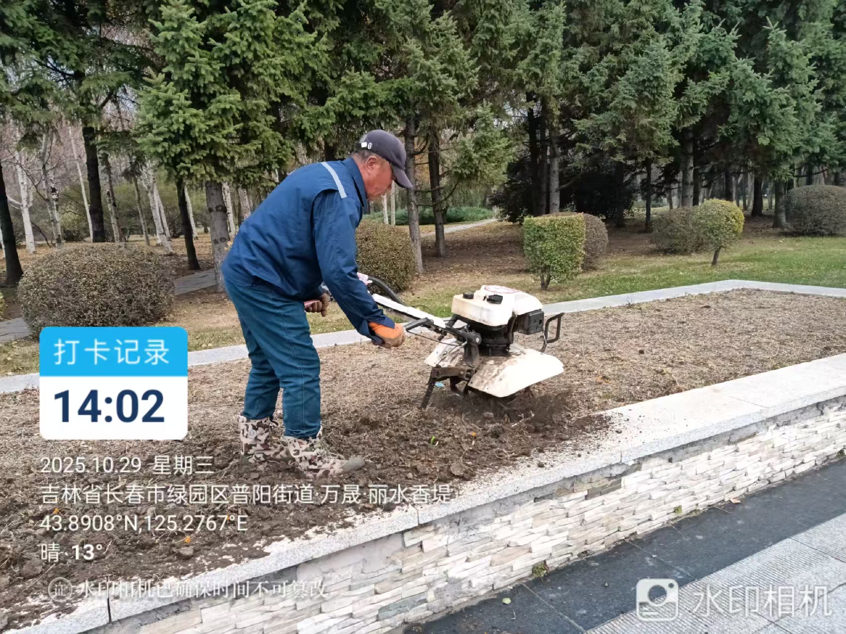 为消除植物残体带来的病虫害隐患,提升园区冬季整体景观整洁度,开展了园区清花杆、旋地作业。全面清理枯萎花杆与残枝,再用机械深耕旋松土壤,为明年植物栽植提供条件。同步开展修剪清运工作,用专业工具修剪干枯枝条,避免其因冬季风雪断裂伤人或压损植被,随后将修剪下的枯枝与地面落叶集中收集、分类清运。