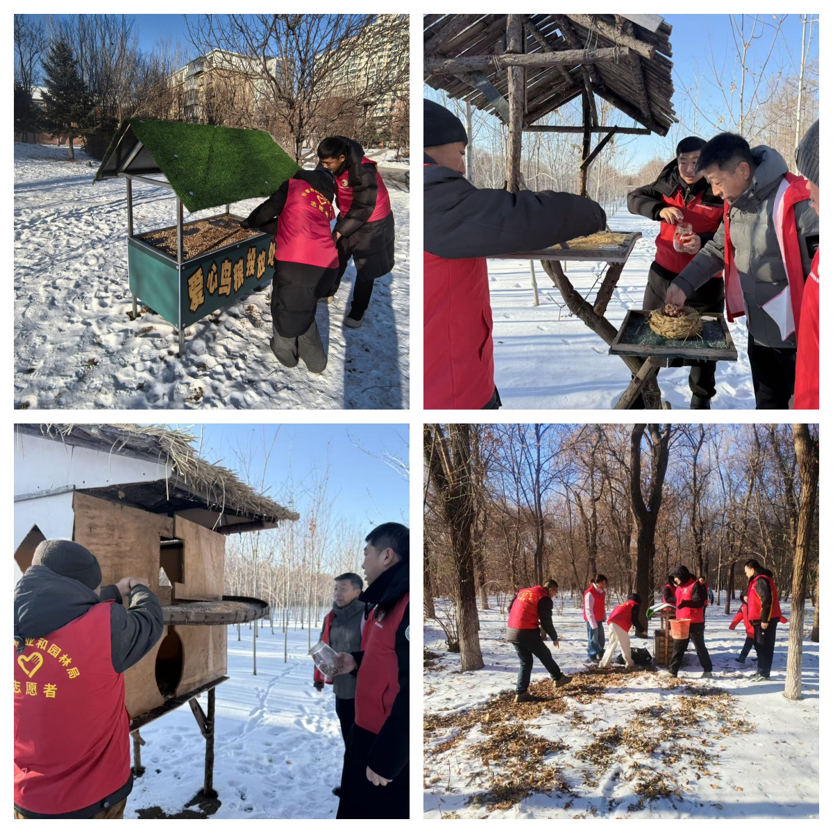 志愿者们分兵行动深入辖区重点街路、百花园、植物园及苗圃等地。一是在设置的多处“爱心鸟食堂”投放营养配比的鸟粮,为冬季觅食困难“城市精灵”送上暖心口粮,让“雪地食堂”成为冬日里的生态风景线。二是志愿者们顶着严寒安装便民座椅垫,精准选址于人民广场、西安广场、景阳广场、新民广场、自由园、繁荣园多处景观节点和休憩区域,用扎实工艺为市民游客、冰雪旅游爱好者打造舒适歇脚处。三是在中心绿化工程一队收发室设置环卫工人临时休息处,早7点至晚5点开放,并提供热水服务。