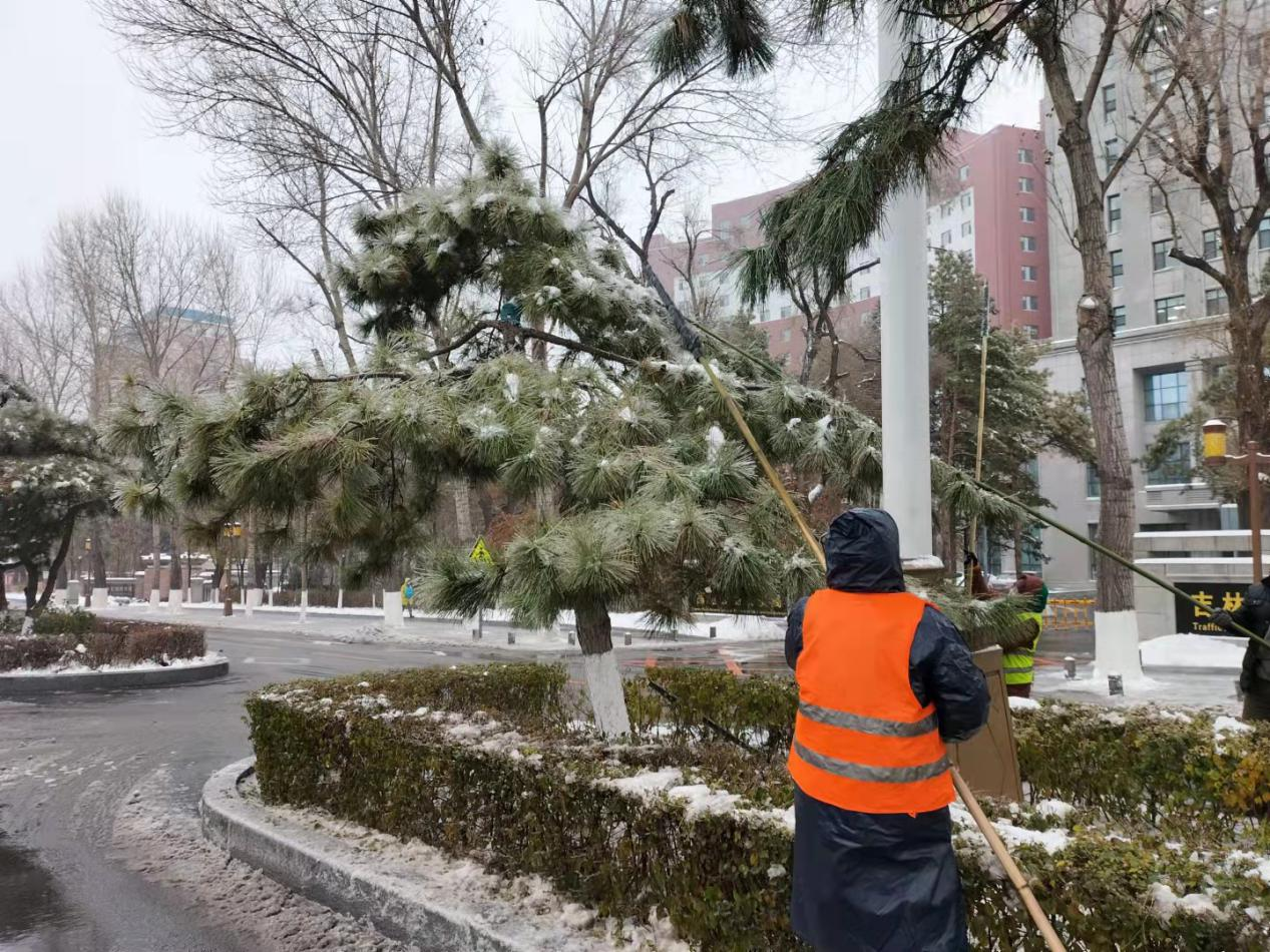 由于本次降雪伴有雨水的情况,气温下降较为明显,这样的天气会在植物表面形成冰冻层,当雨雪量逐渐加大,植物表面重量随之加大,容易造成植物折断或倒伏。为此绿理中心绿化工程一队制定详细科学的应对方案,针对24条不同街路特点共组建10支处理队伍每组8-10人,由专业技术人员带领,24小时不间断对所辖街路巡视,险情及时处理。同时对有针叶类树种的街路,出动工人2组,利用竹竿等工具及时将积雪打落,避免折枝及安全隐患。